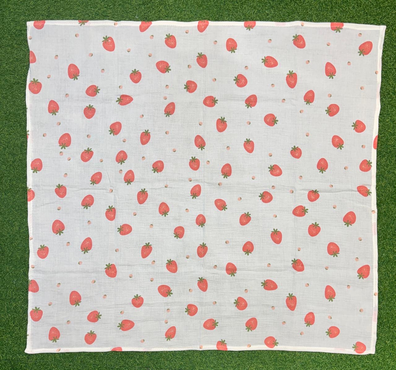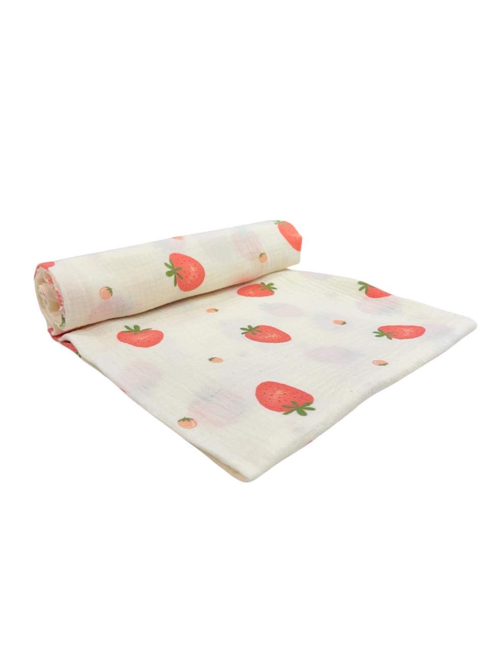 ​​Brighten up your nursery with the sweet and vibrant Strawberry Fields Muslin Swaddle. This delightful wrap features a crisp white background decorated with charming, hand-painted style strawberry prints. The cheerful red fruit and green leafy accents create a fresh, adorable look for your little one.