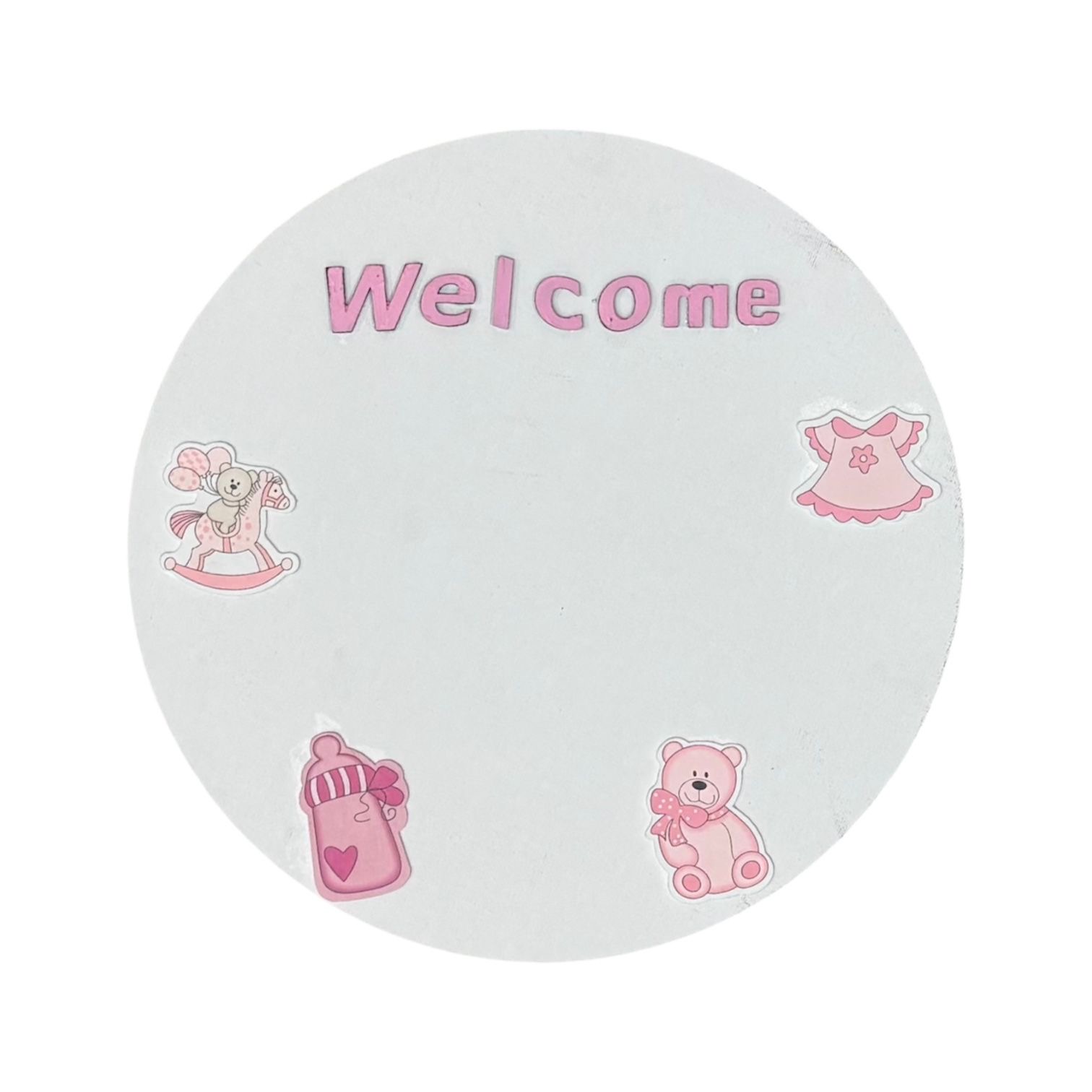• A cute round canvas decorated with charming baby girl elements like a pink dress, a teddy bear, a feeding bottle, a rocking horse, and the soft pink word “Welcome,” with space to add a baby’s name, birth details, or a special message.