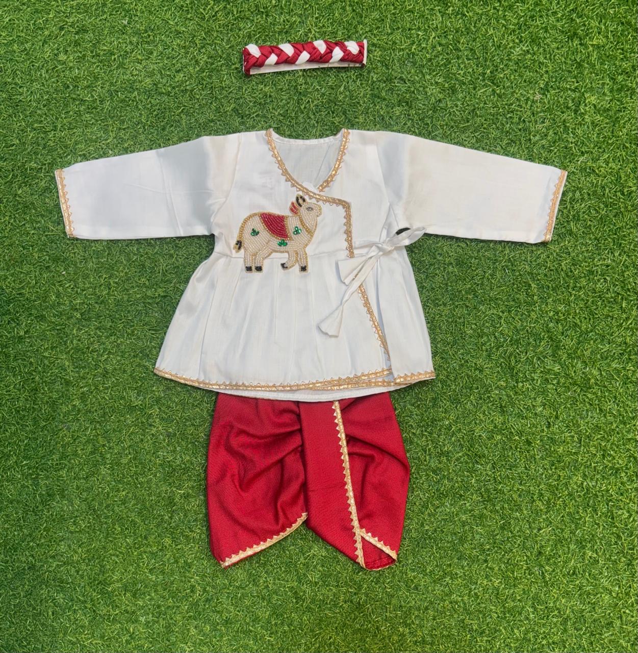 - 👕 The white angrakha-style top features full sleeves, a soft side tie-up, and delicate golden lace borders. A beautifully embroidered cow motif on the front adds a traditional and auspicious touch.