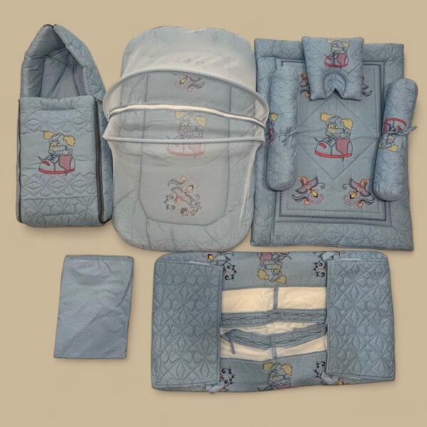 Baby Embroidery Combo Set – 6 in 1. A complete care package designed for your little one’s comfort, safety, and cozy sleep. Made with soft quilted fabric & cute embroidery designs, this set is perfect for everyday use and gifting.