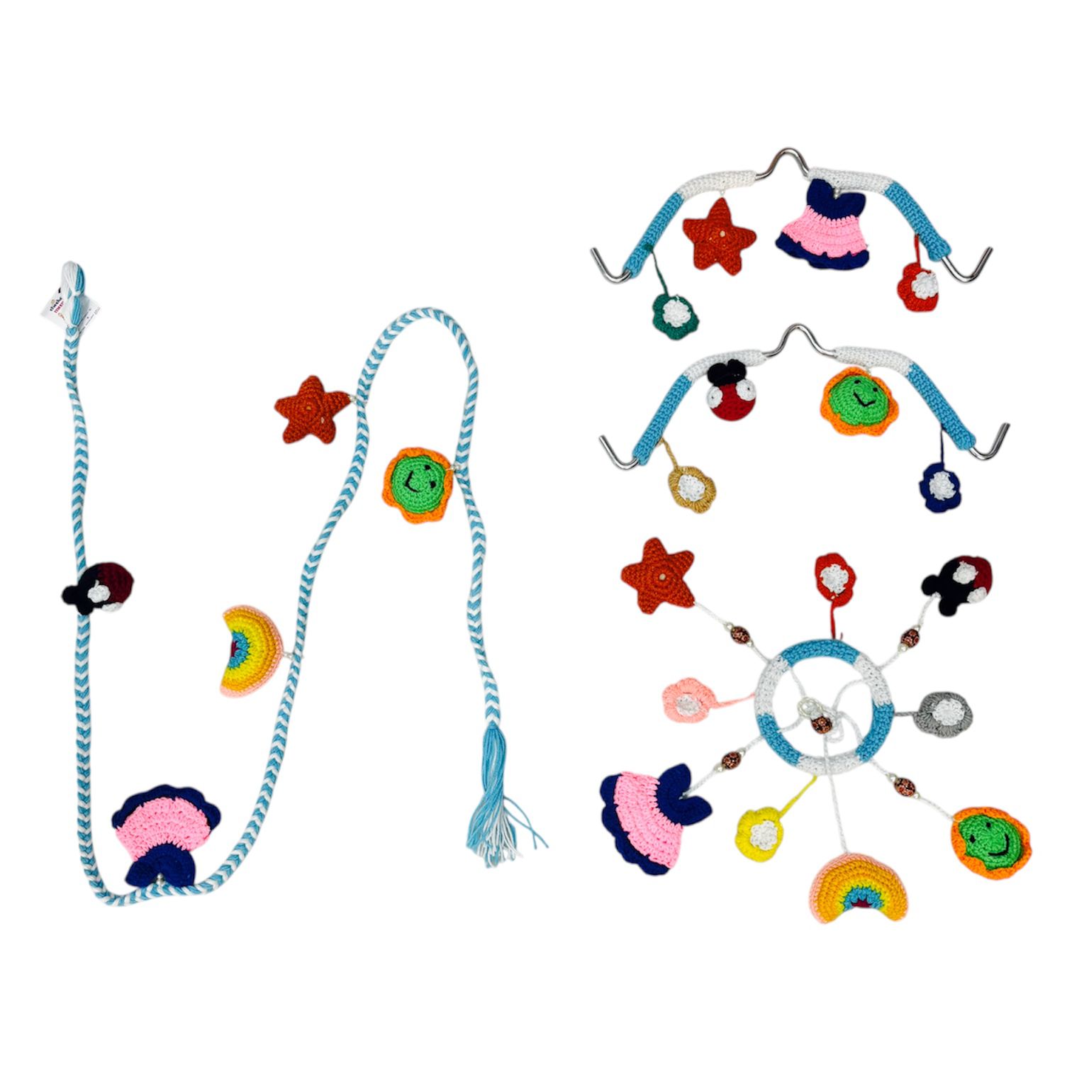 - 2 Side Hanging Pangra Arches: Designed to hang over the cradle handles, these feature brightly colored arms and hanging crocheted motifs to captivate your baby’s attention.