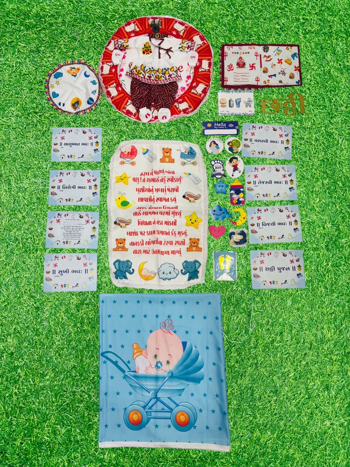 Celebrate your baby boy’s Chhathi with this beautifully curated set featuring soft fabrics, bright prints and auspicious motifs. A complete kit for rituals, blessings and decoration.