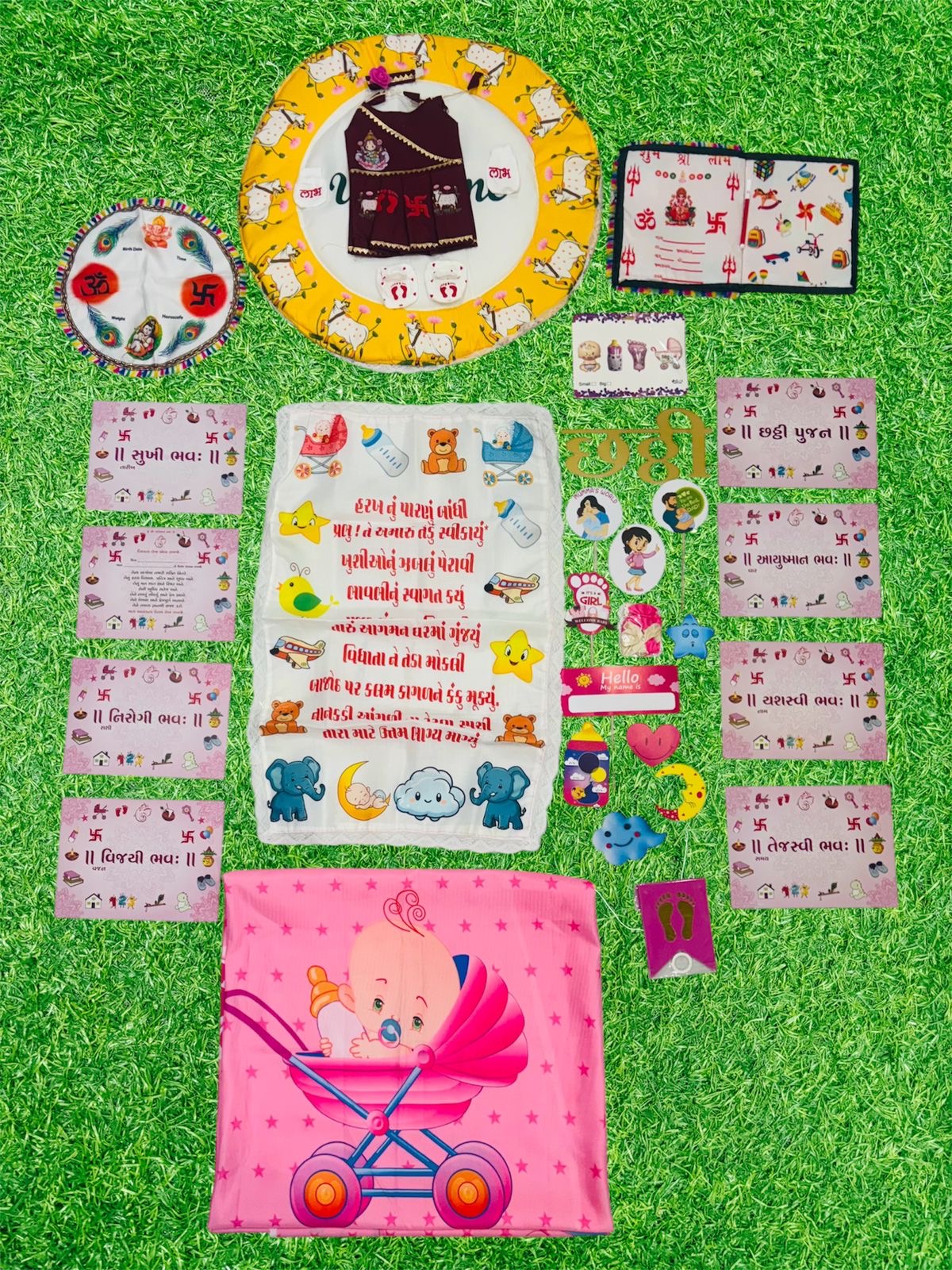 Celebrate your baby girl’s Chhathi with this beautifully curated traditional set featuring soft fabrics, vibrant prints, and auspicious motifs. This complete combo includes everything needed for rituals, blessings, decoration, and adorable photography.
